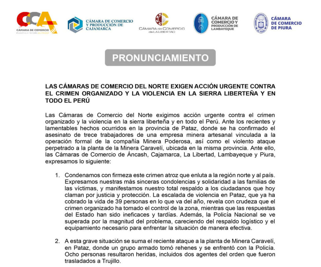 La Libertad, 5 de mayo de 2025 – Las Cámaras de Comercio del Norte exigimos acción urgente contra el crimen organizado y la violencia en la sierra liberteña y en todo el Perú. Ante los...