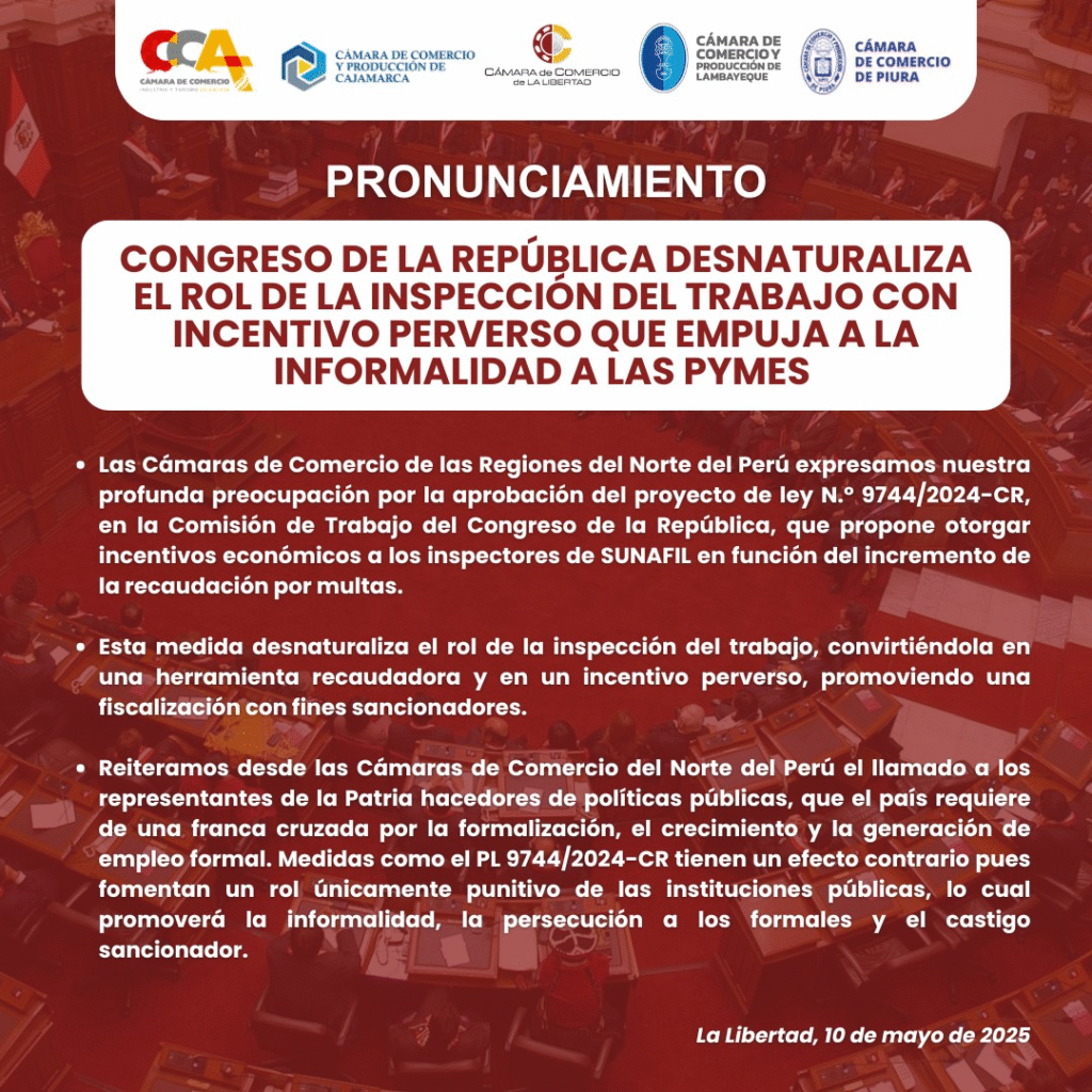 La Libertad, 10 de mayo de 2025 – Las Cámaras de Comercio de las Regiones del Norte del Perú expresaron su profunda preocupación por la aprobación del proyecto de ley N.° 9744/2024-CR, en la Comisión de Trabajo del Congreso de la República, que propone otorgar incentivos económicos a los inspectores de SUNAFIL en función del incremento de la recaudación por multas. 🚨